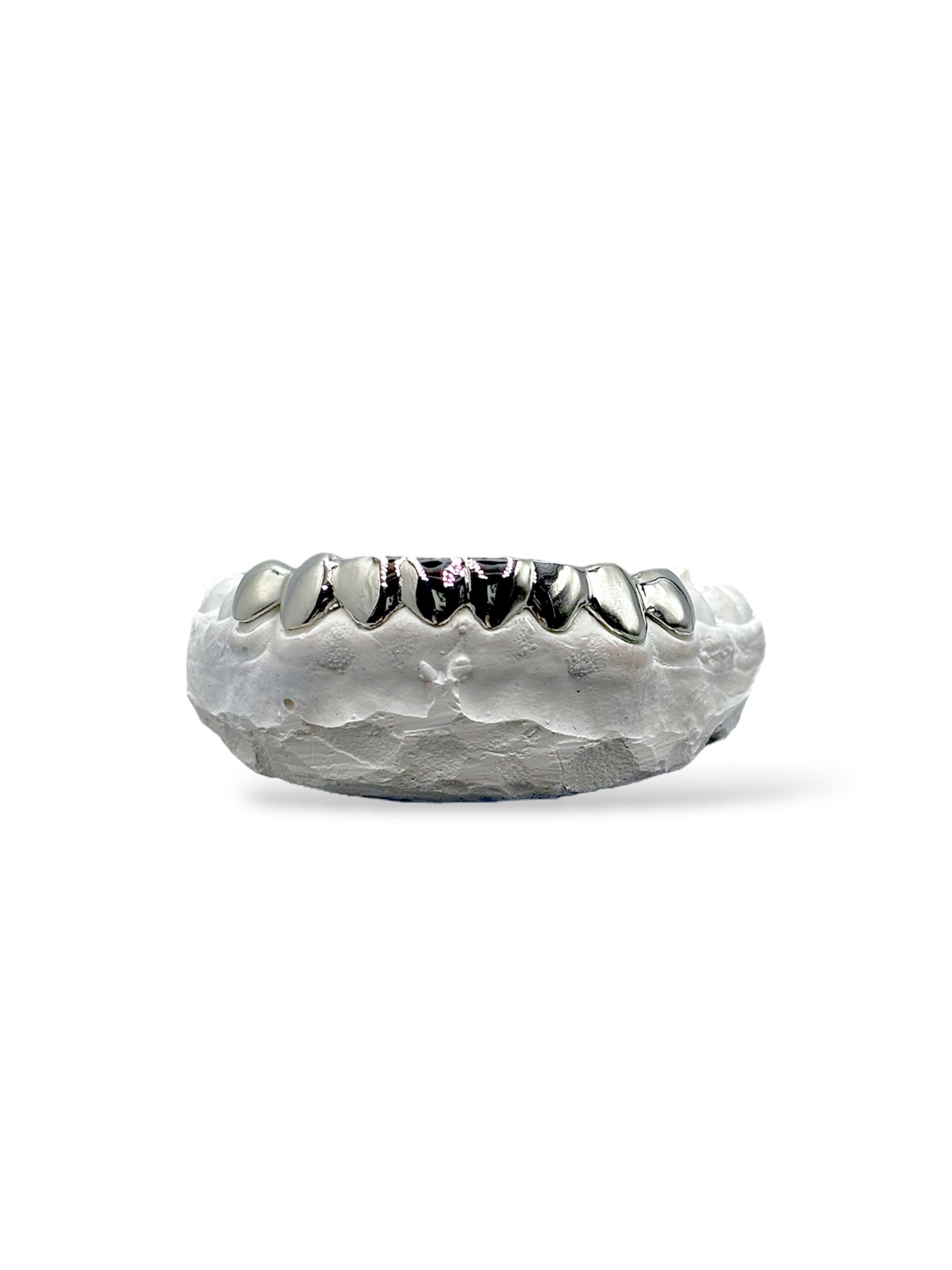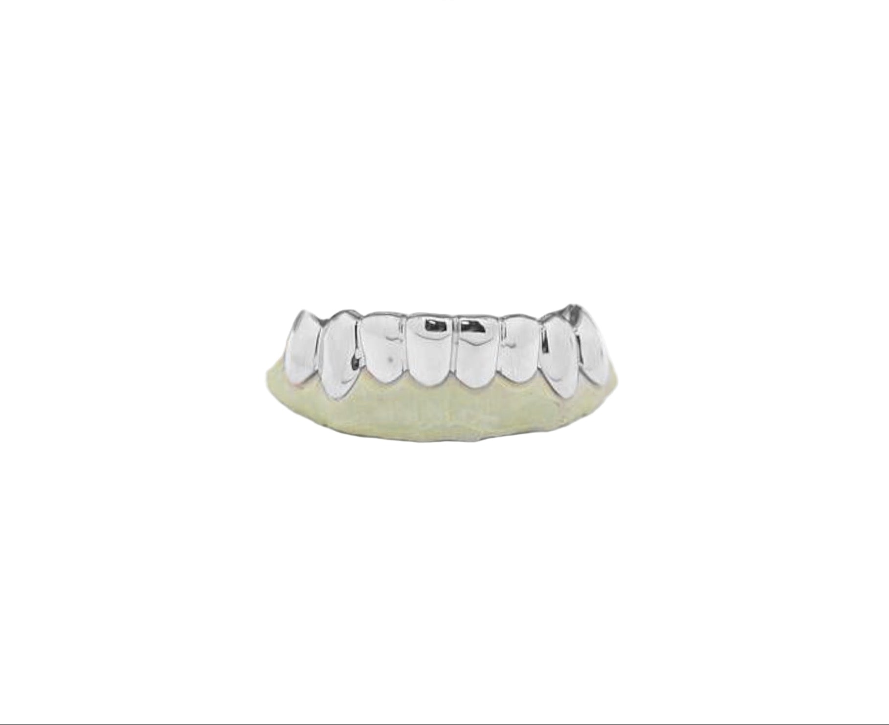 Handmade with precision and care, this full silver 8-piece grill is a testament to craftsmanship and artistry. Each piece is custom-fitted to your mold, sculpted and polished by skilled hands to achieve a flawless chrome-like shine. The result is a set that doesn’t just sit on your teeth—it transforms your smile into a work of wearable art.